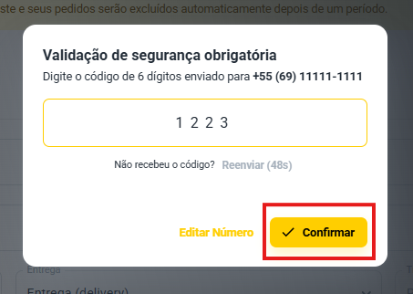 Após enviar o código, irá aparecer esta tela para você inserir o código de 4 dígitos e validar o seu número