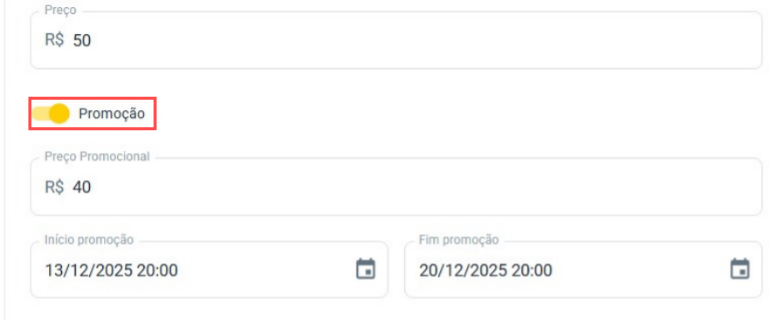 Você irá marcar o campo "Promoção" e, ao fazer isso, o campo "Preço Promocional" será desbloqueado. Além disso, será necessário definir a data e hora de início e a data e hora de término da promoção.