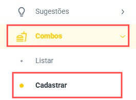 Primeiro, abra o menu lateral no canto superior esquerdo do seu painel. Role até encontrar a opção “Combos” e toque em “Cadastrar”.