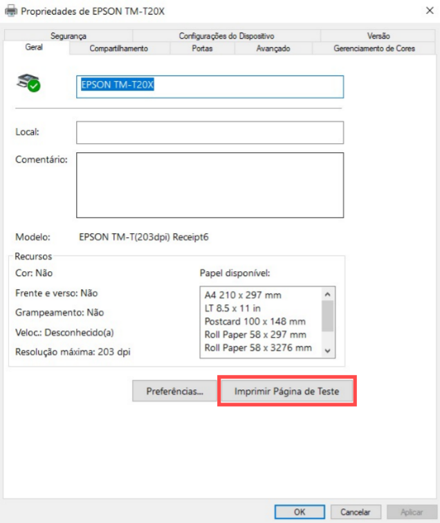 Clique em Imprimir página de teste para confirmar se a impressora está funcionando corretamente.