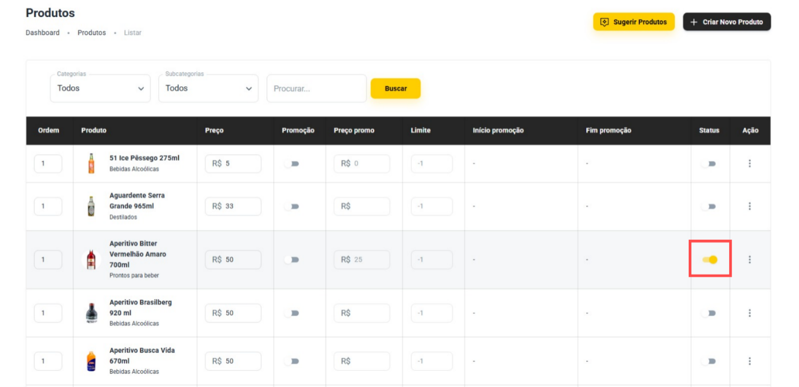 Quando o status estiver amarelo 🟡, significa que o produto está ativo e aparecerá no aplicativo.