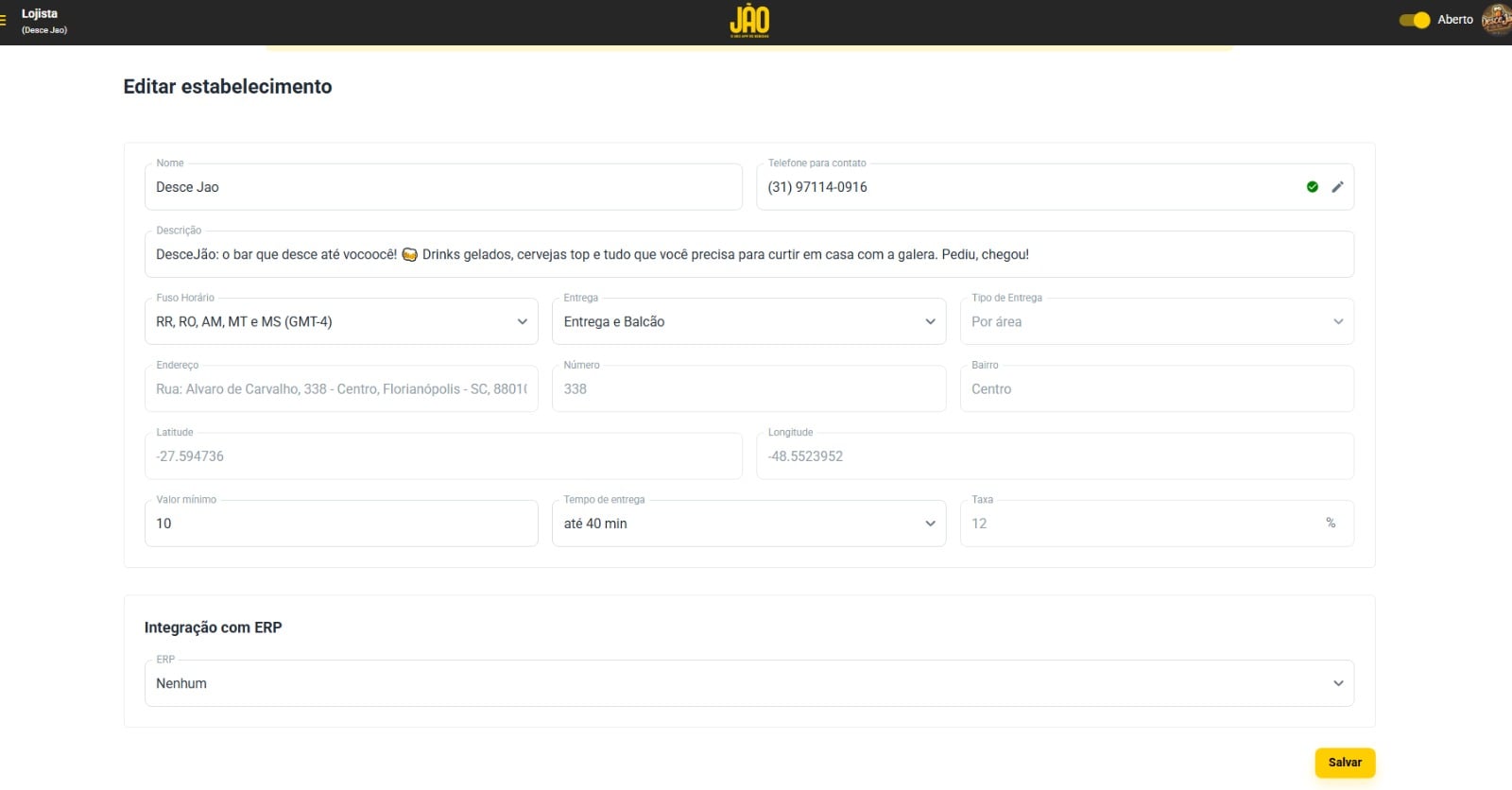 Edite a informação desejada, como telefone, nome do estabelecimento, número, tempo estimado de entrega, fuso horário do painel ou valor mínimo do estabelecimento.