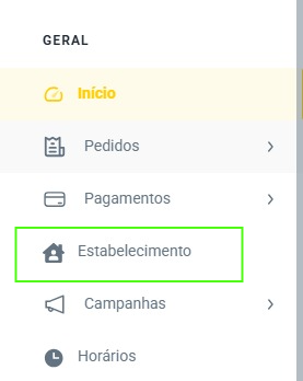 Mas para editar outras informações, como tempo de previsão de entrega, número de telefone e outros detalhes do seu estabelecimento, é só clicar no menu lateral “Estabelecimento”.