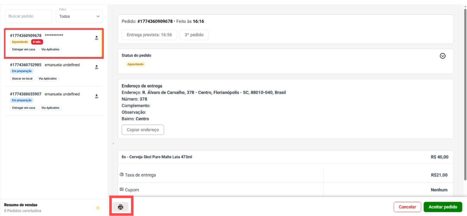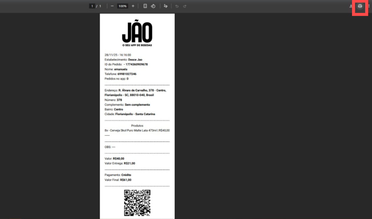 Após selecionar a opção de impressão, você será redirecionado para uma página onde verá o ícone de impressora no canto superior direito. Clique nesse ícone para confirmar a impressão do pedido: