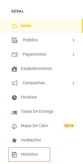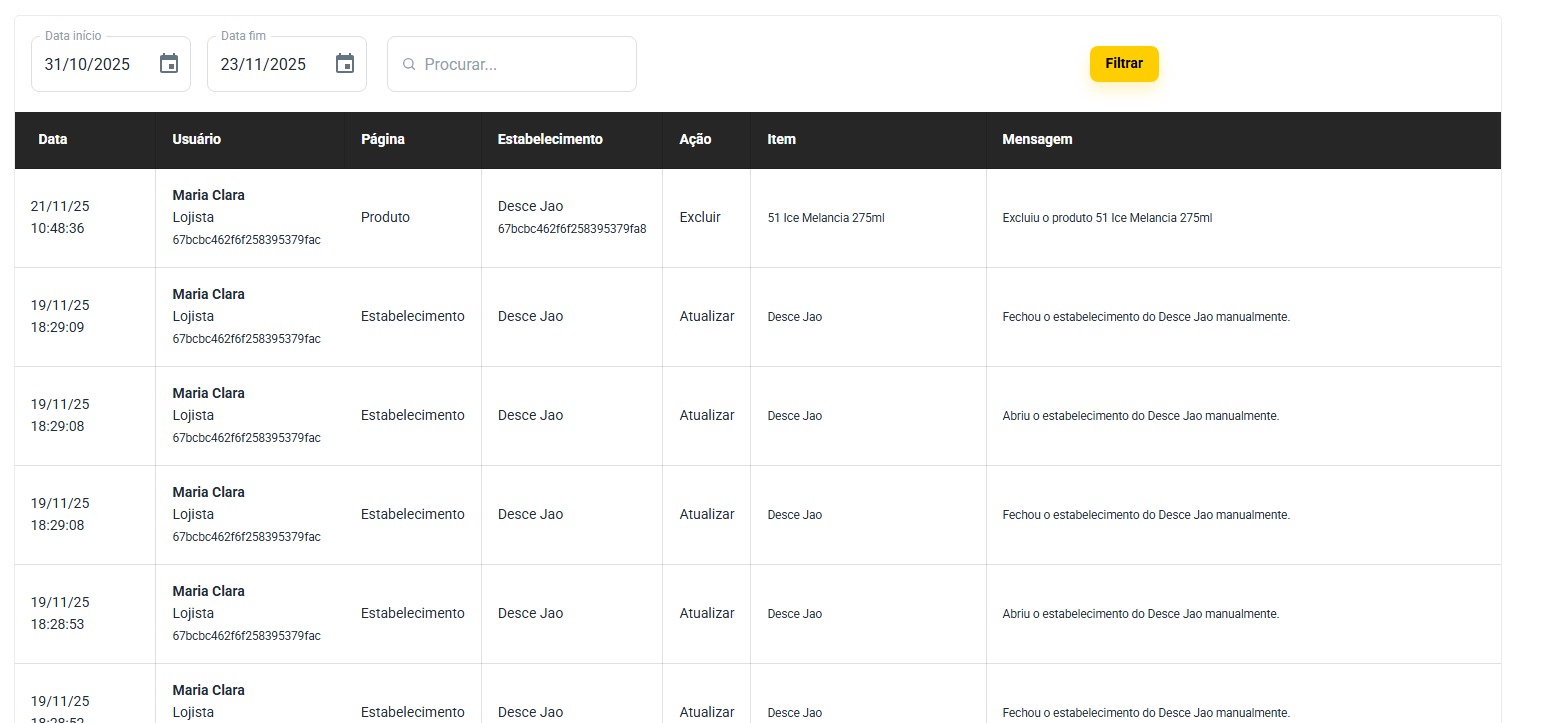 Nessa aba, você terá acesso à tela de histórico, onde poderá visualizar os logs, por exemplo: horário em que o estabelecimento foi aberto, quem abriu, aceite de pedidos, entre outros.