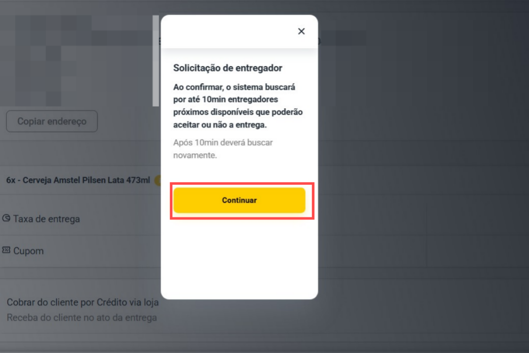 Confirme em “Continuar”, o sistema buscará por 10 minutos um entregador disponível que aceite a corrida.