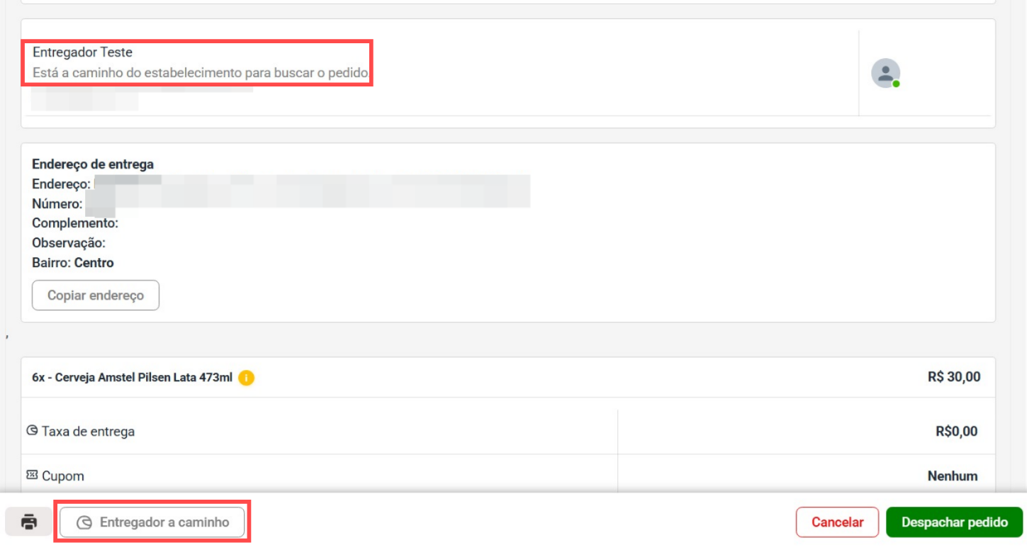 Assim que o entregador aceitar a corrida, o sistema exibirá o entregador que aceitou, mostrando a informação como ‘Entregador a caminho’: