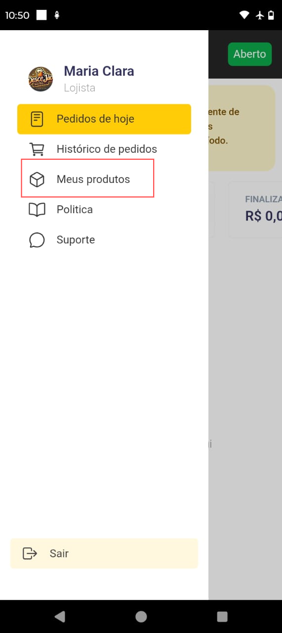 Com o app aberto, vá no menu e clique em “Meus produtos”.