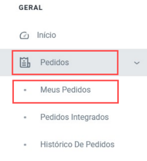 Para começar, vá até o Menu no painel do lojista, acesse a aba Pedidos e, em seguida, clique em Meus Pedidos: