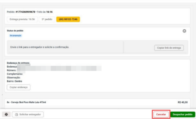 Um lembrete importante: se você estiver usando o entregador do aplicativo, é necessário solicitar o entregador antes de despachar o pedido. Isso porque, após clicar em Despachar, não será mais possível solicitar o entregador pela plataforma.