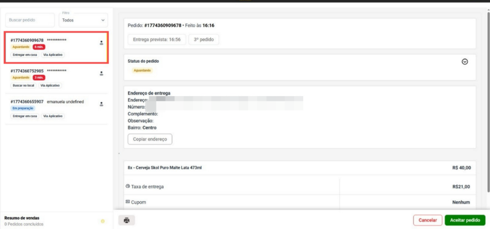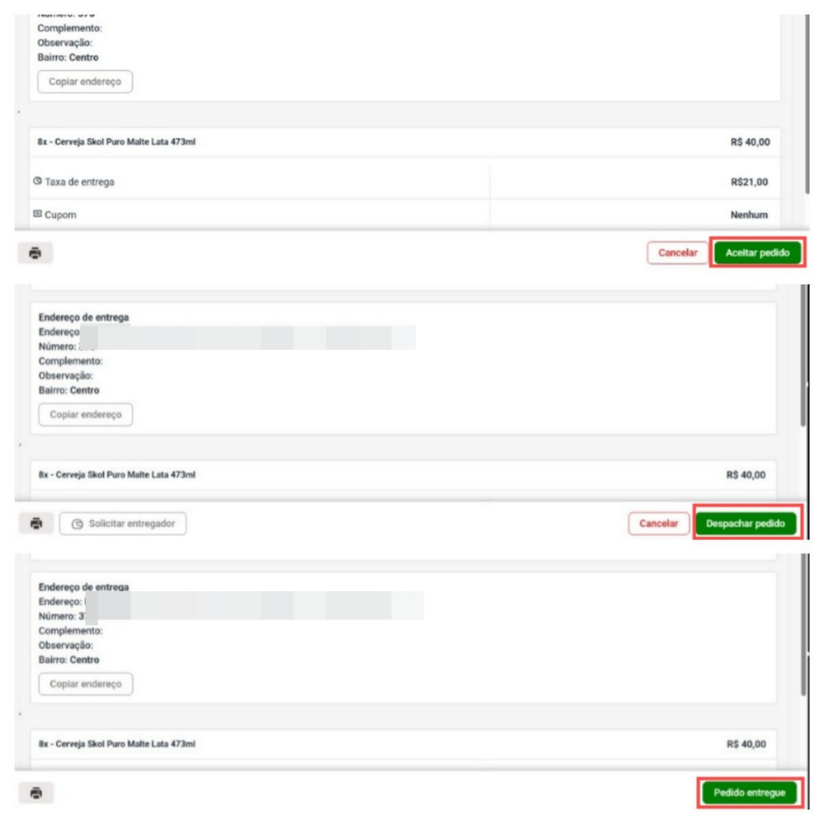 Para aceitar e finalizar um pedido, clique em Aceitar. Em seguida, selecione Despachar para dar continuidade à entrega. Por fim, quando o pedido for entregue ao cliente, marque como Pedido Entregue.