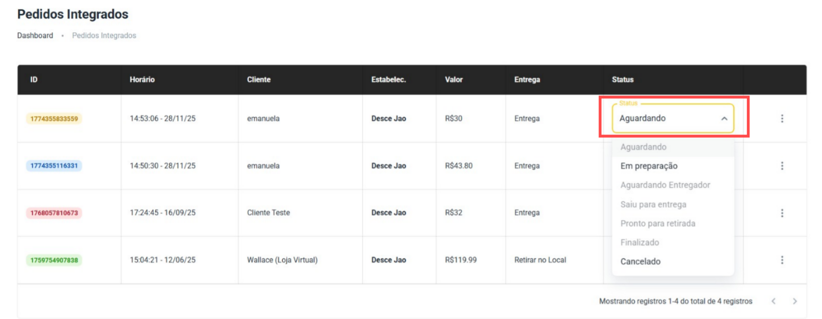 Para aceitar, recusar ou gerenciar o pedido, basta clicar no seletor conforme mostrado abaixo: