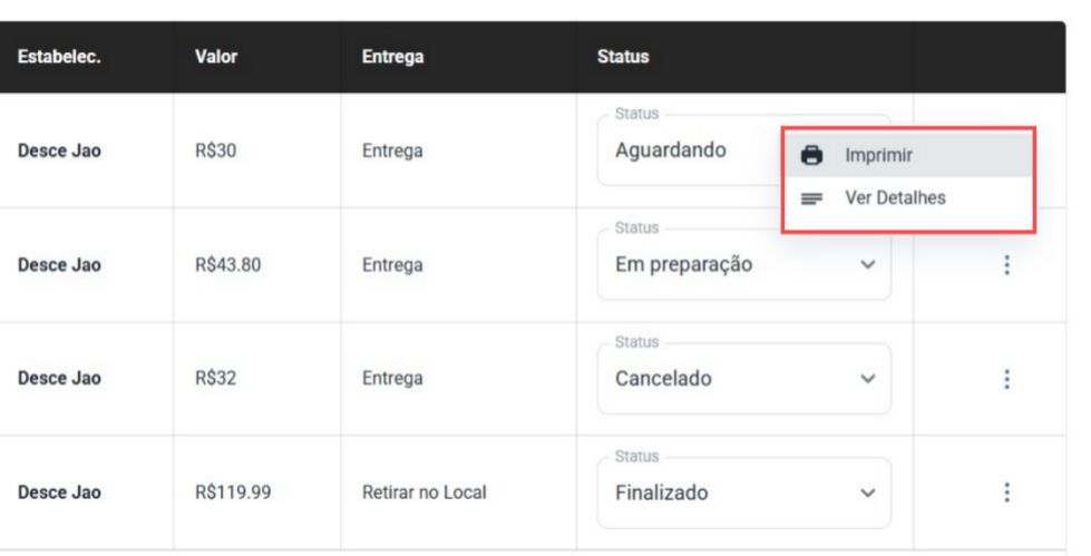 Para imprimir o pedido ou ver mais detalhes clique nos 3 pontinhos e irá aparecer as opções abaixo: