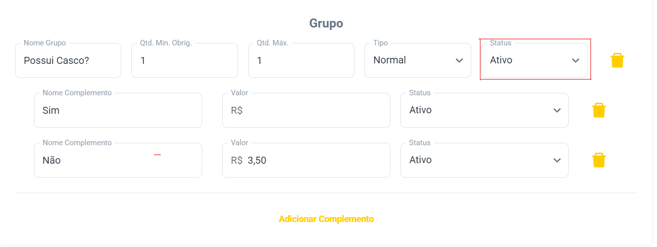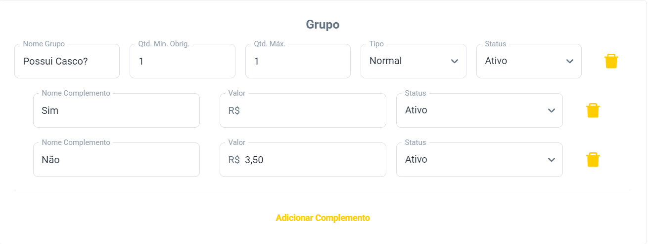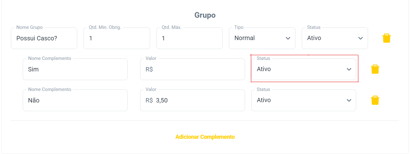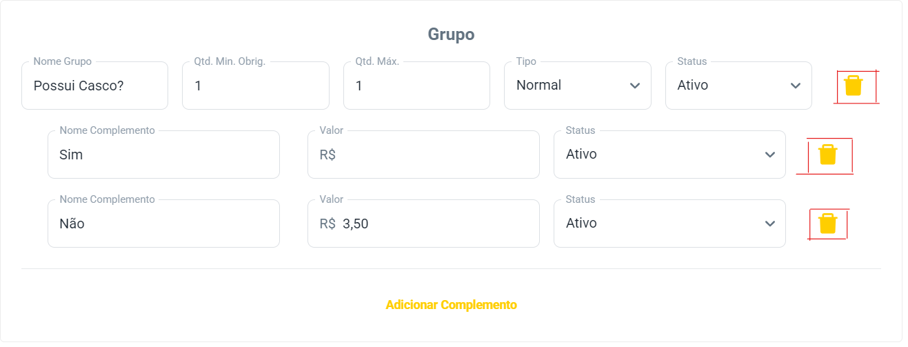 Se quiser excluir algum grupo de complementos ou um complemento especifico, pode estar clicando nas lixeirinhas laterais conforme destacado no exemplo abaixo: