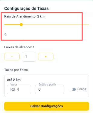 E o seu raio de atendimento é de 2 km, então você deverá criar 2 faixas de entrega, pois cada faixa representa uma divisão dentro desse raio.