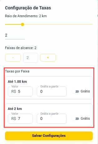 Após escolher quantas faixas de alcance seu estabelecimento terá, o próximo passo é definir o valor de entrega de cada faixa.