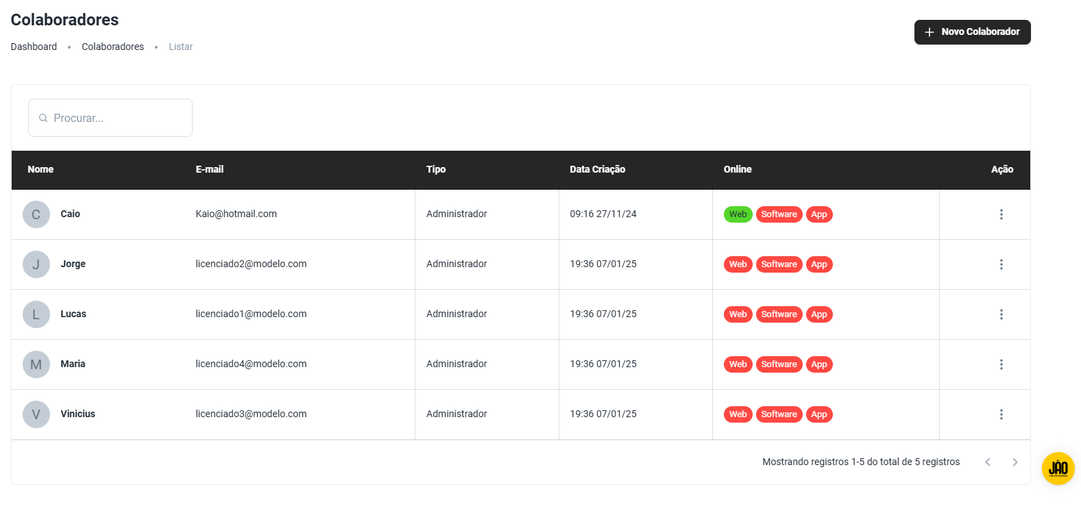 Ao clicar na opção “Listar”, será exibida uma lista com todos os colaboradores cadastrados. Nessa tela, você pode visualizar informações como nome, e-mail, tipo de usuário e status (online ou offline).