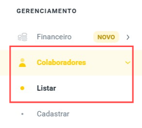 Acesse o menu lateral e clique na opção “Colaboradores” e depois em “Listar”. Nessa área, você consegue visualizar e gerenciar todos os colaboradores já cadastrados na plataforma.