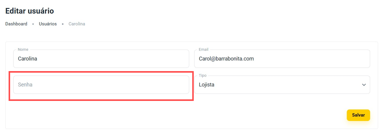 Após clicar em "Editar", você será redirecionado para uma página onde poderá realizar a alteração da senha. Insira a nova senha no campo indicado.