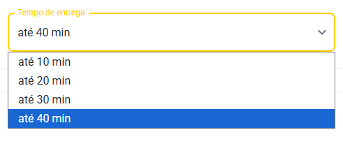 Na página do estabelecimento, localize a seção "Tempo de Entrega". Utilize o menu suspenso para selecionar o tempo estimado de entrega desejado.