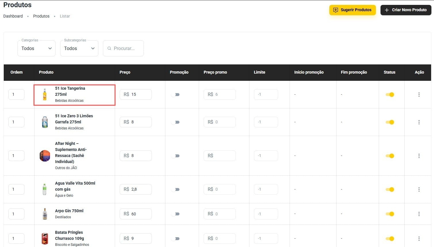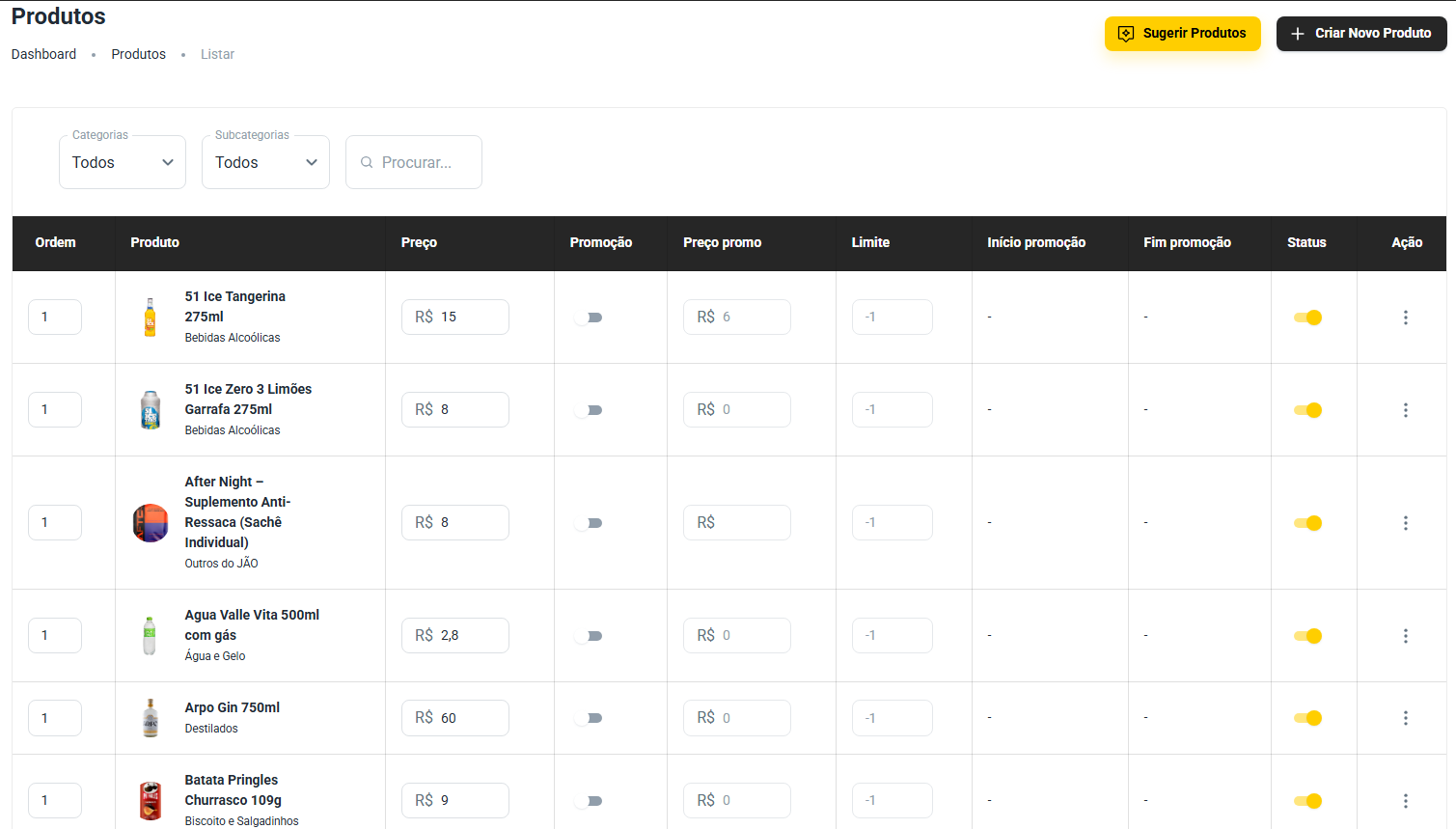 Ao clicar em "Cardápio", será exibida a página listando todos os produtos disponíveis no seu estabelecimento.