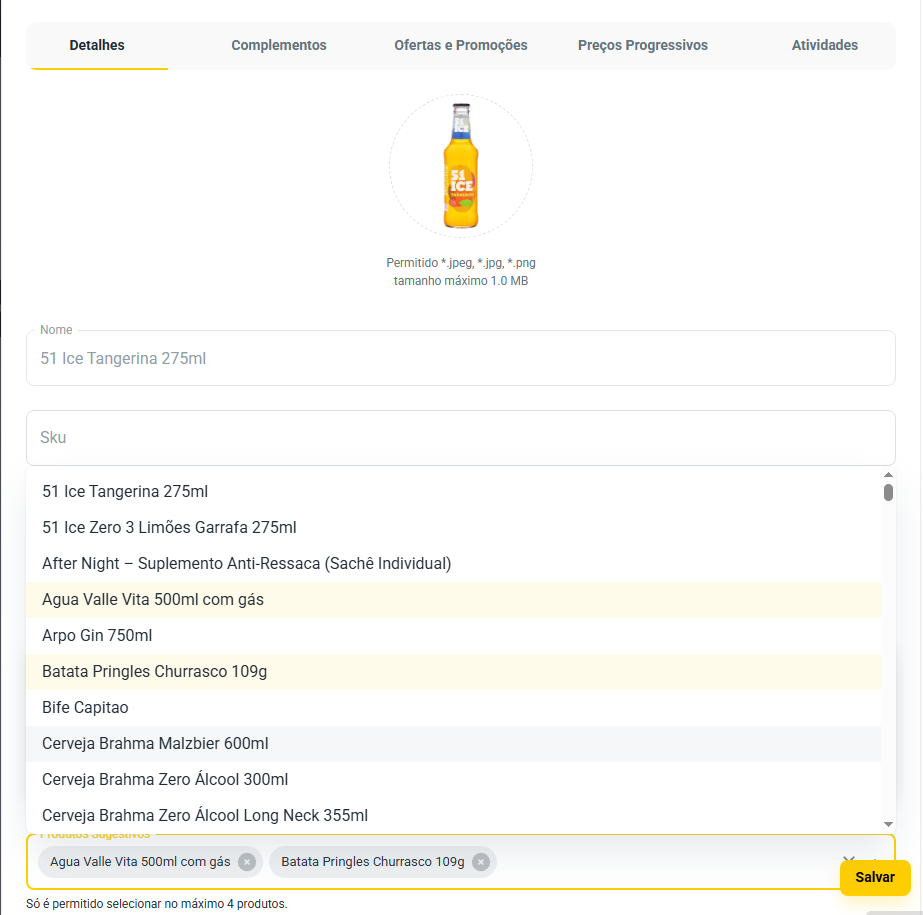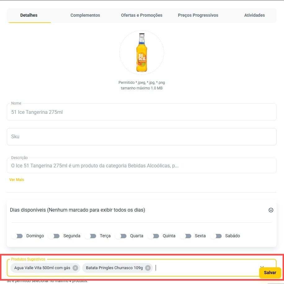 Na seção "Detalhes", localize o campo "Produtos Sugestivos". Clique no menu suspenso e selecione até quatro produtos que deseja sugerir quando o cliente estiver finalizando o pedido do produto selecionado.