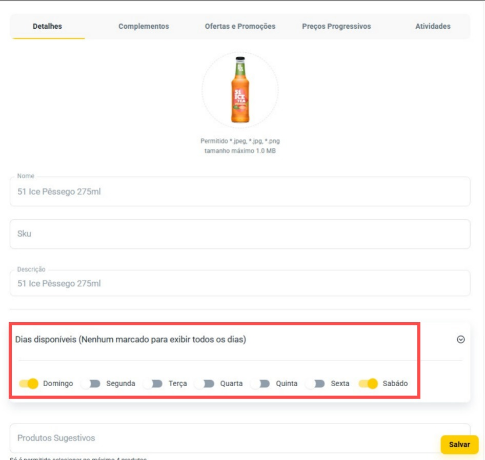 Após selecionar os dias da semana desejados, clique no botão "Salvar" para confirmar as alterações. O produto estará disponível apenas nos dias selecionados.