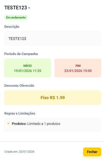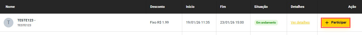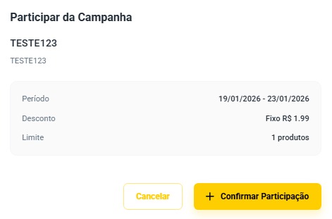 Nessa tela, você poderá visualizar detalhes como o período da campanha, o desconto aplicado e o limite de compra por usuário antes de confirmar a participação.