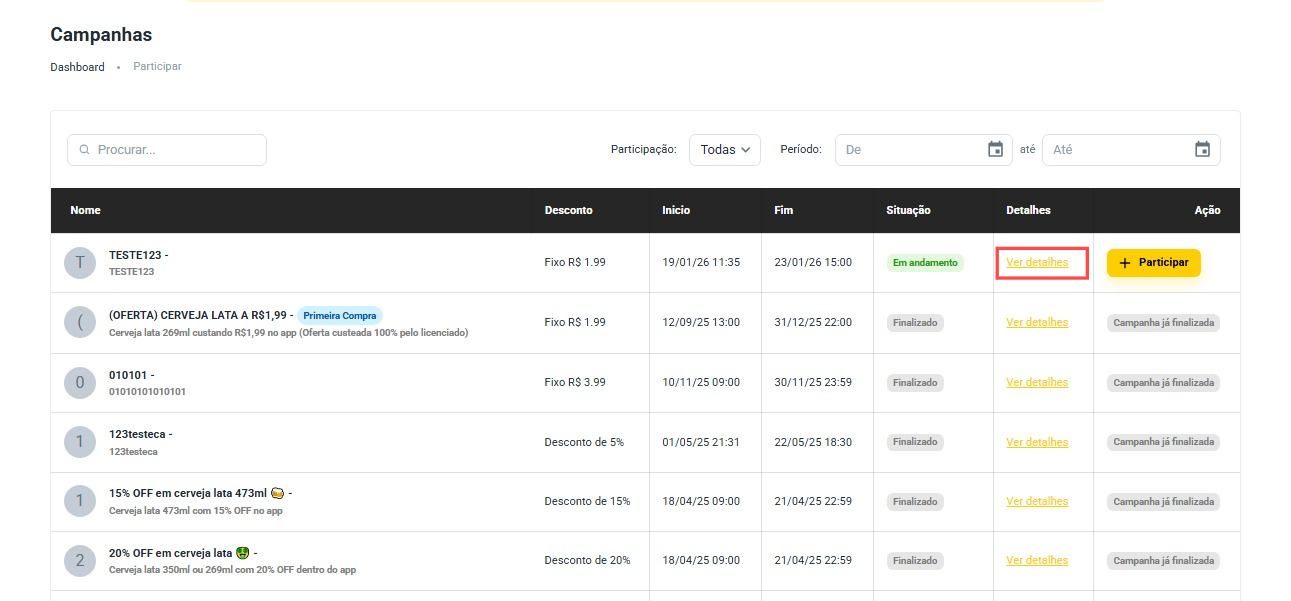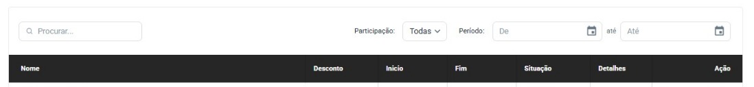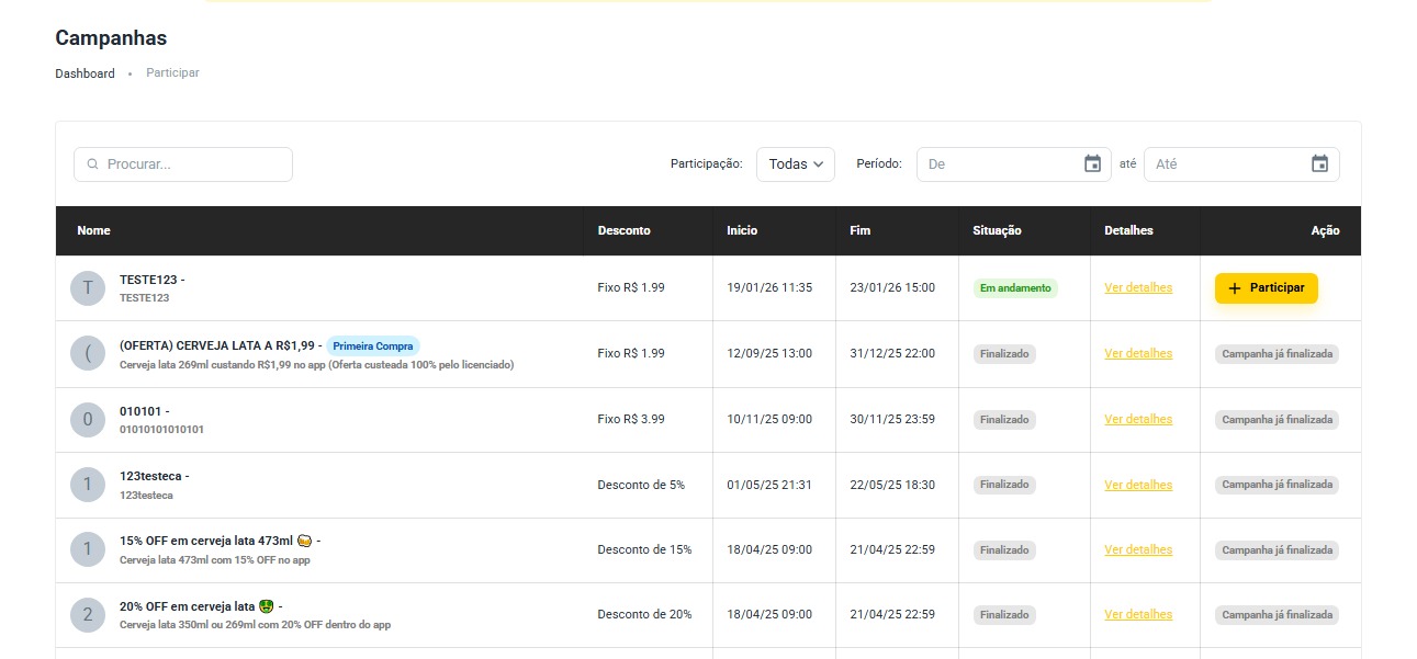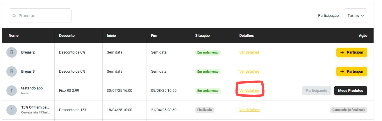 Utilize a barra de busca para encontrar a campanha específica que deseja participar. Você verá uma lista com o nome, tipo de desconto e situação de cada campanha.