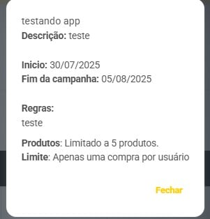 Ao clicar em Ver detalhes, uma janela pop-up exibirá as informações detalhadas da campanha, incluindo as datas de início e término, regras específicas e limitações.