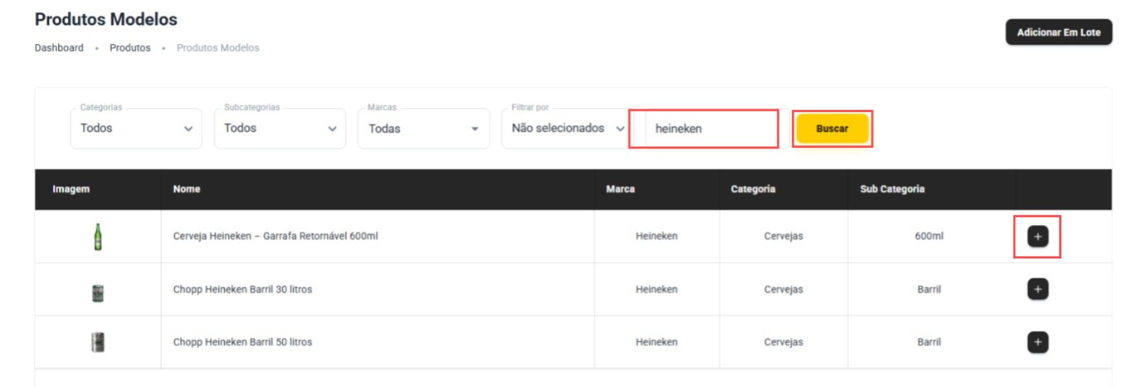 Depois, procure na barra de pesquisa o produto que deseja adicionar e clique no ícone '