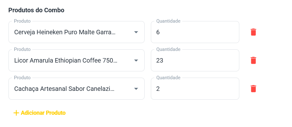 Ao clicar em "Adicionar Produtos", você poderá selecionar os itens que deseja incluir no combo e definir as quantidades de cada um, conforme a foto abaixo.